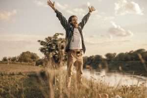 Excited explorer enjoying freedom in countryside