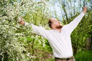 Man allergic enjoying after treatment from seasonal allergy in front of blossom tree at spring.