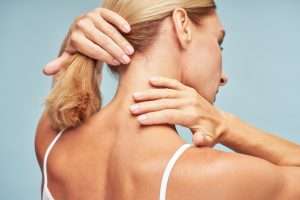 Rear view of a mature woman touching her neck with soft and clean skin while standing against blue background